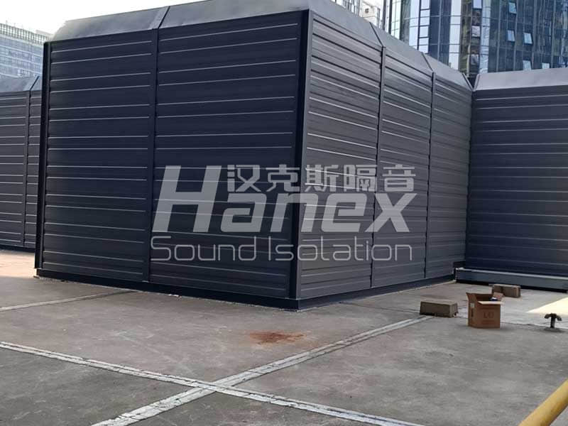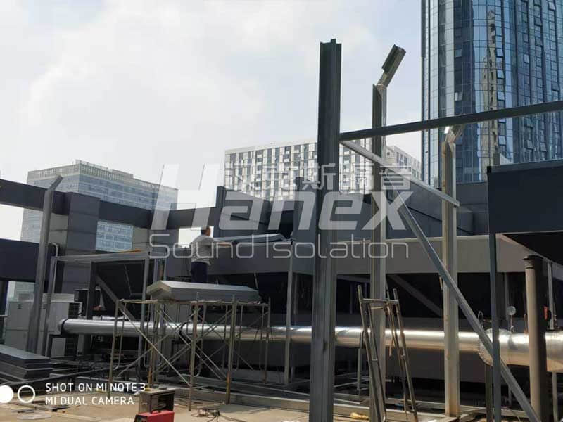 3、根據(jù)現(xiàn)場實際情況,空調(diào)機組底部的壓縮機周圍無阻擋,我司技術(shù)人員發(fā)現(xiàn)壓縮機工作運行時所產(chǎn)生的噪聲往外擴散,影響其周邊環(huán)境。因此,我司技術(shù)人員結(jié)合以往同類項目案例經(jīng)驗,采用隔音板對空調(diào)機組底部壓縮機四周進(jìn)行圍擋,控制其工作產(chǎn)生的噪聲往外擴散。同時從空調(diào)機組頂部做500mm隔聲掛板,防止壓縮機產(chǎn)生的噪聲從頂部溢出擴散到周圍環(huán)境。