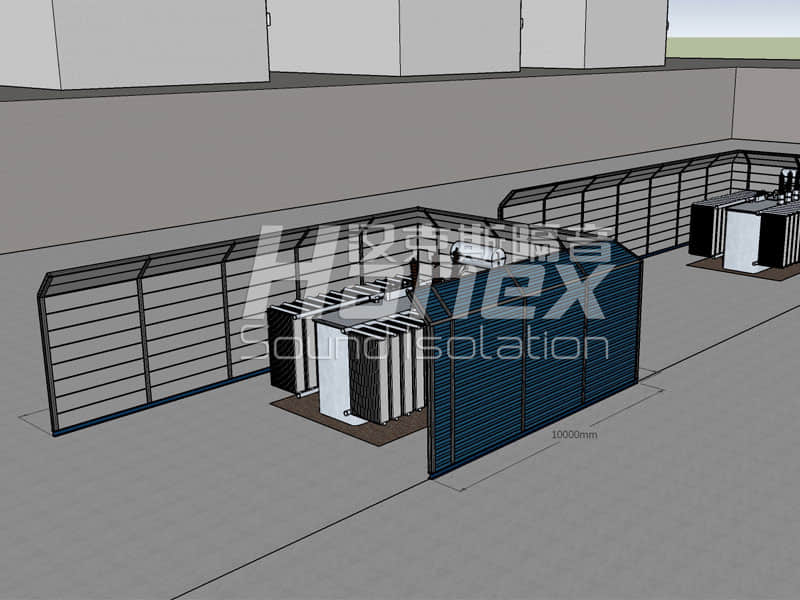 根據(jù)現(xiàn)場噪聲源值大小、頻譜、噪聲源與附近居民樓位置關系、設備通風散熱要求等因素,結(jié)合我們漢克斯隔音以往同類型項目分析,設計對該變電站采用2道U型屏障的方式進行降噪處理。